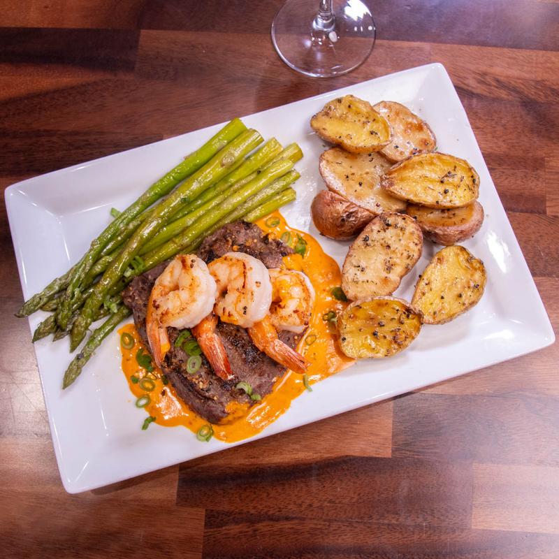 10 oz TenderTop Sirloin, topped with 3 jumbo shrimp. Served with seasoned roasted potato's, Chefs vegetables and Harissa sauce.